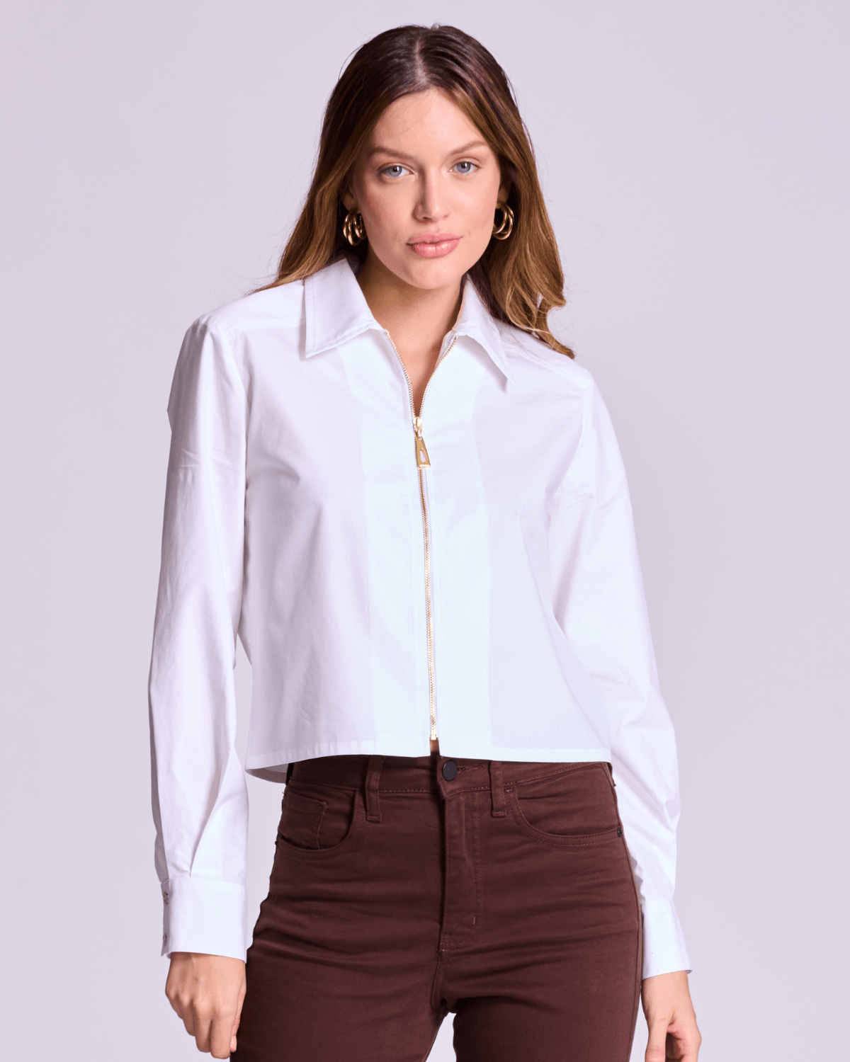 O destaque fica por conta do fechamento frontal em zíper metálico, que substitui a clássica abotoação e adiciona personalidade ao look. A gola tradicional e os punhos marcados equilibram a proposta, criando uma peça versátil que transita entre o casual refinado e produções mais sofisticadas.