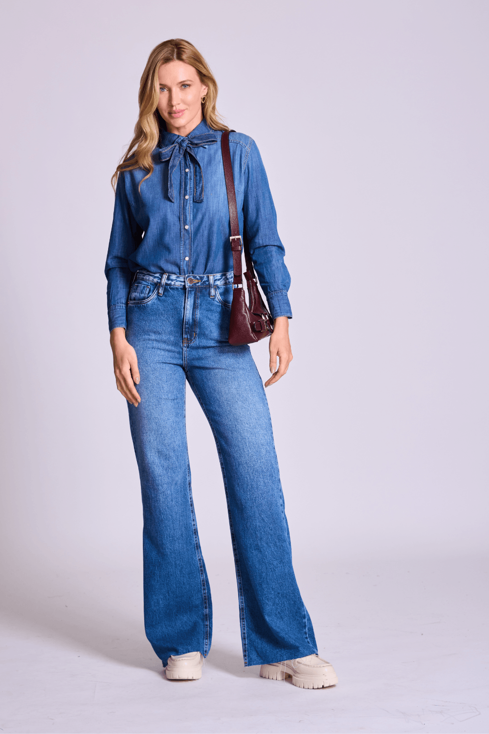 A camisa jeans feminina com laço no pescoço traz uma releitura sofisticada do clássico denim. Com design elegante e feminino, é a peça ideal para quem busca um visual moderno com personalidade.