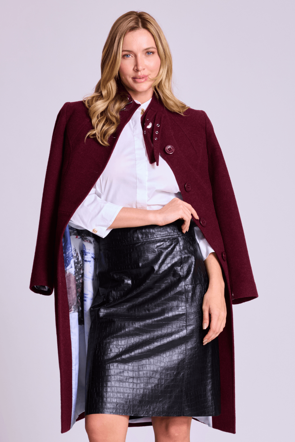 Na tonalidade vinho, intensa e sofisticada, o casaco se destaca como uma escolha elegante e atemporal, ideal para composições que vão do formal ao casual chic.