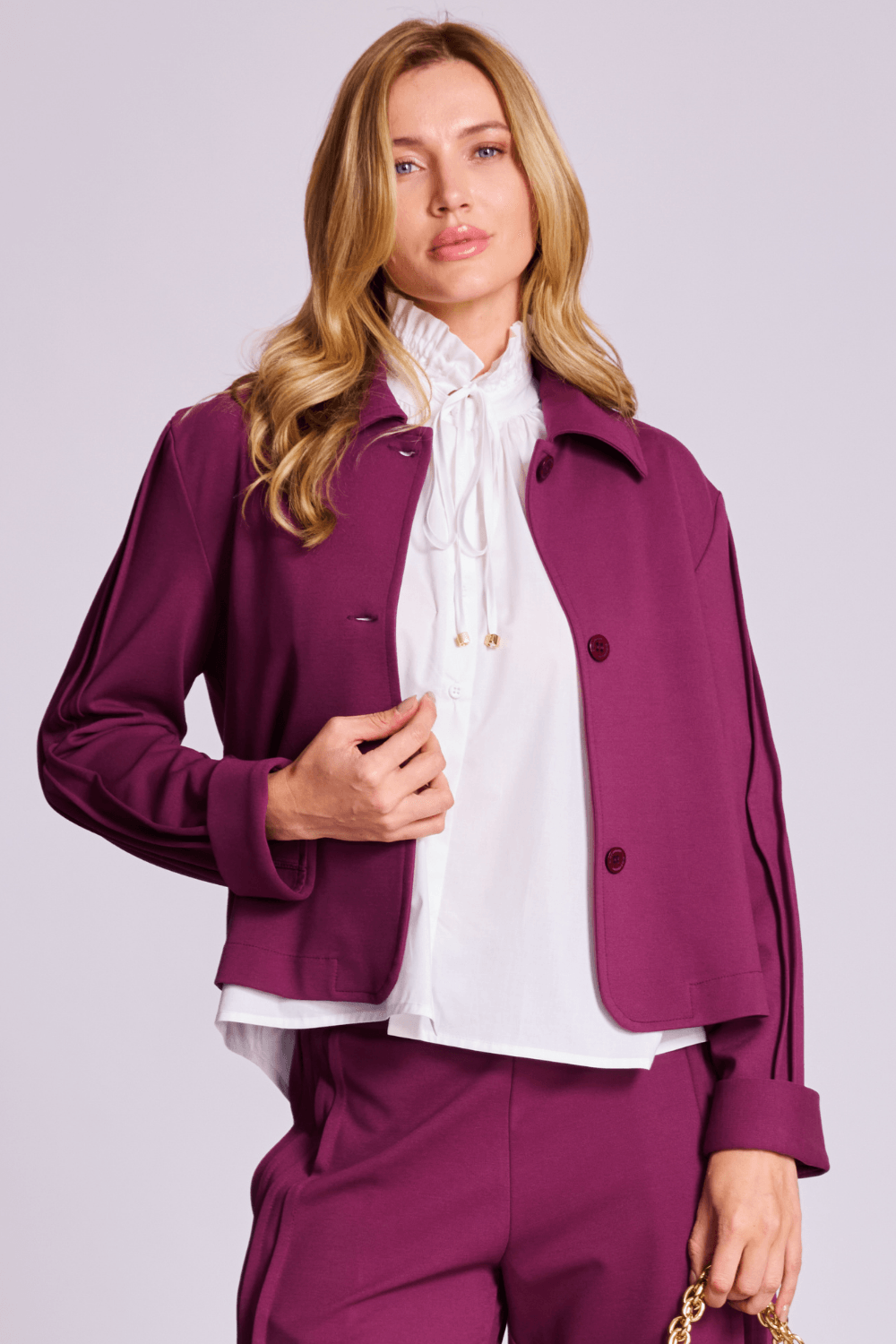 Na tonalidade roxa — intensa e sofisticada — o casaqueto se destaca como um item-chave para looks modernos e impactantes.