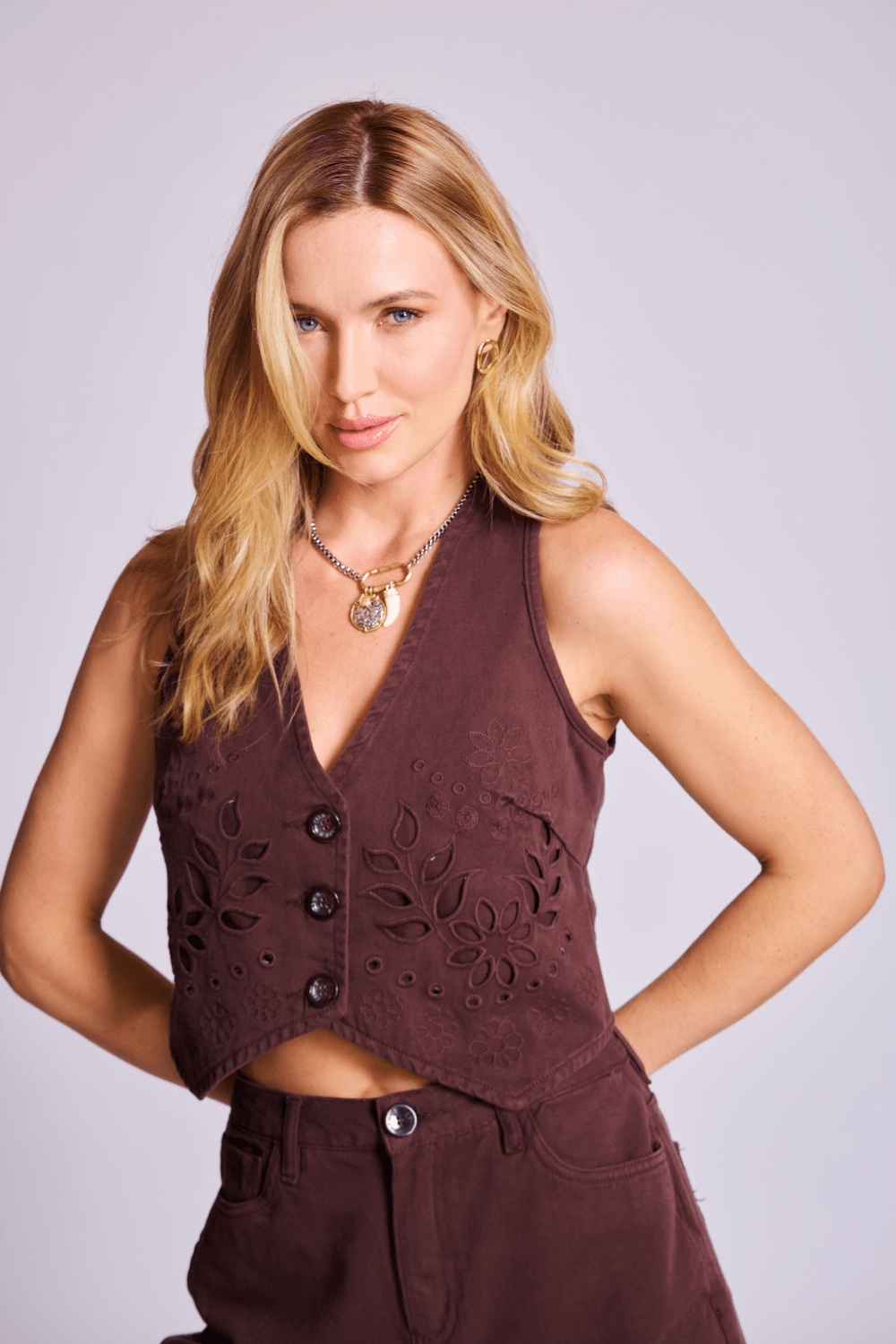 Colete Cropped Marrom Bordado – Elegância Moderna com Detalhes Artesanais