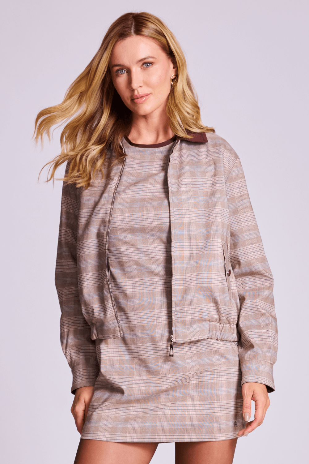 O padrão xadrez em tons neutros reforça sua versatilidade, enquanto a gola contrastante e o fechamento por zíper trazem um toque moderno e urbano à composição.