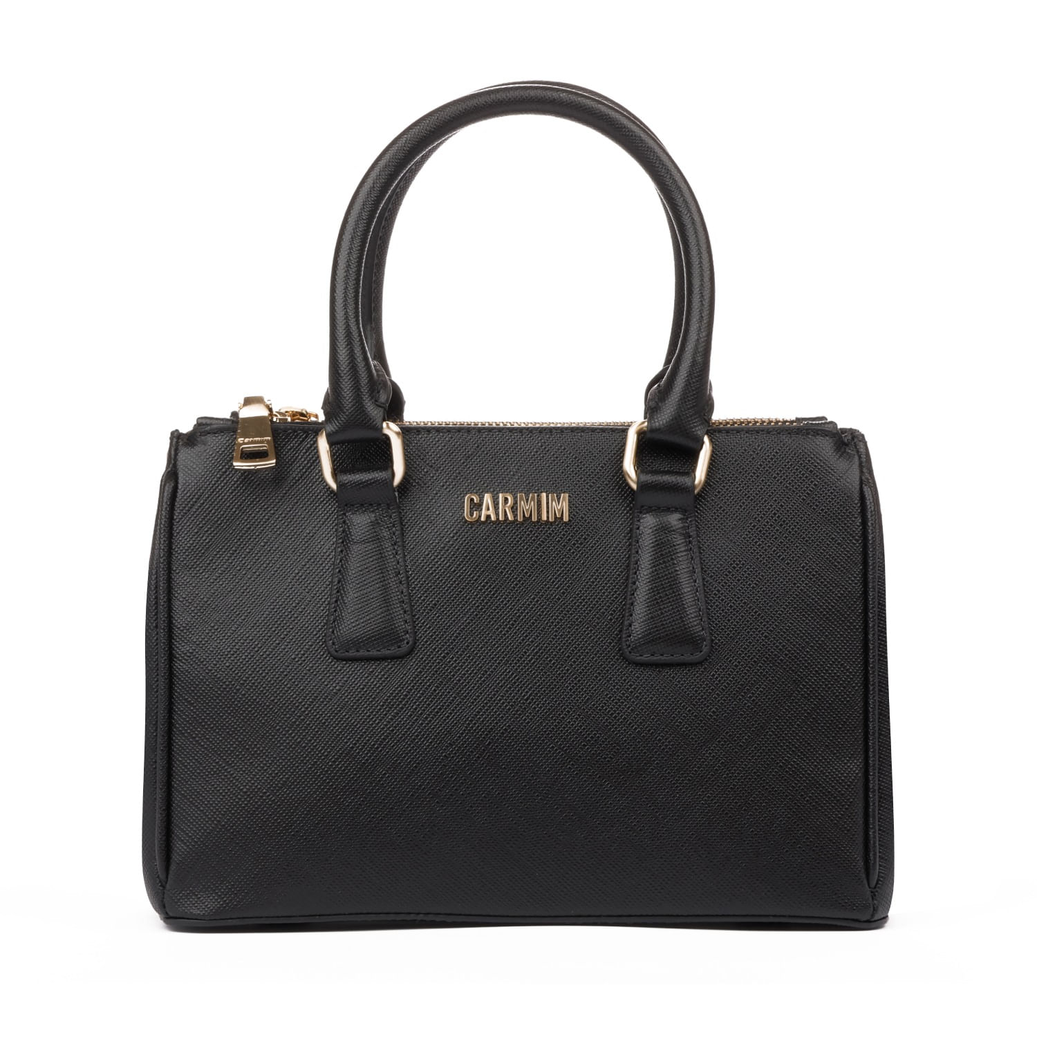 Possui duas divisórias com zíper e puxador personalizado Carmim.