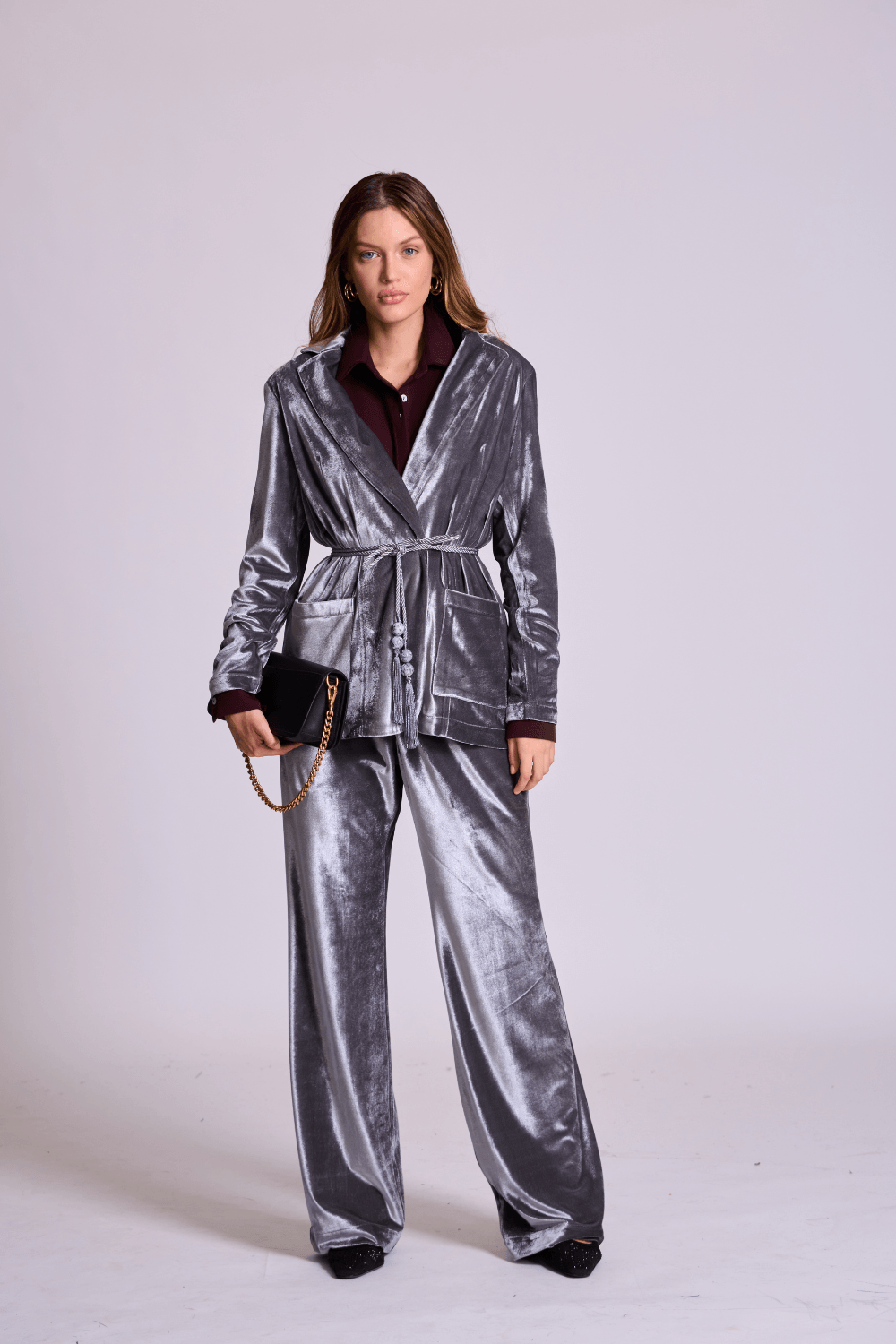 A calça em veludo metalizado prata combina sofisticação e modernidade em uma peça marcante e elegante. O tecido com brilho sutil traz textura e personalidade ao visual, criando um look contemporâneo e cheio de estilo.