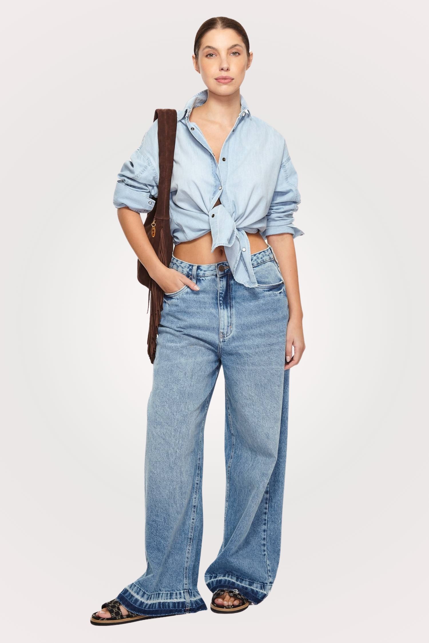 A Calça é confeccionada em jeans de lavagem média, possui modelagem pantalona, cós com passantes, fechamento frontal por zíper e botão, cinco bolsos e acabamento pespontado.