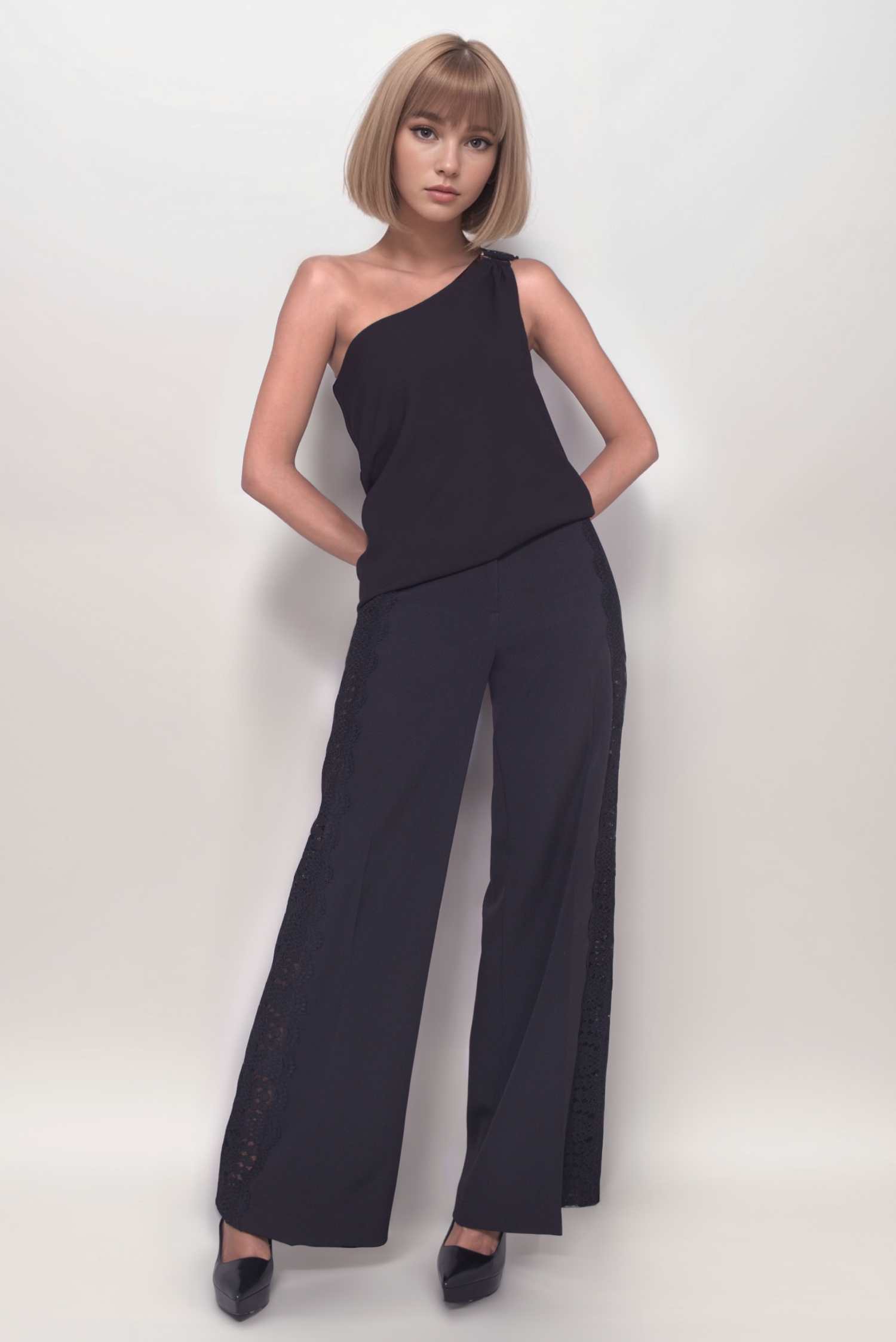 A Calça é confeccionada em laise, possui transparência, modelagem em alfaiataria, cós com passantes e acabamento pespontado. A peça acompanha cinto do mesmo tecido.