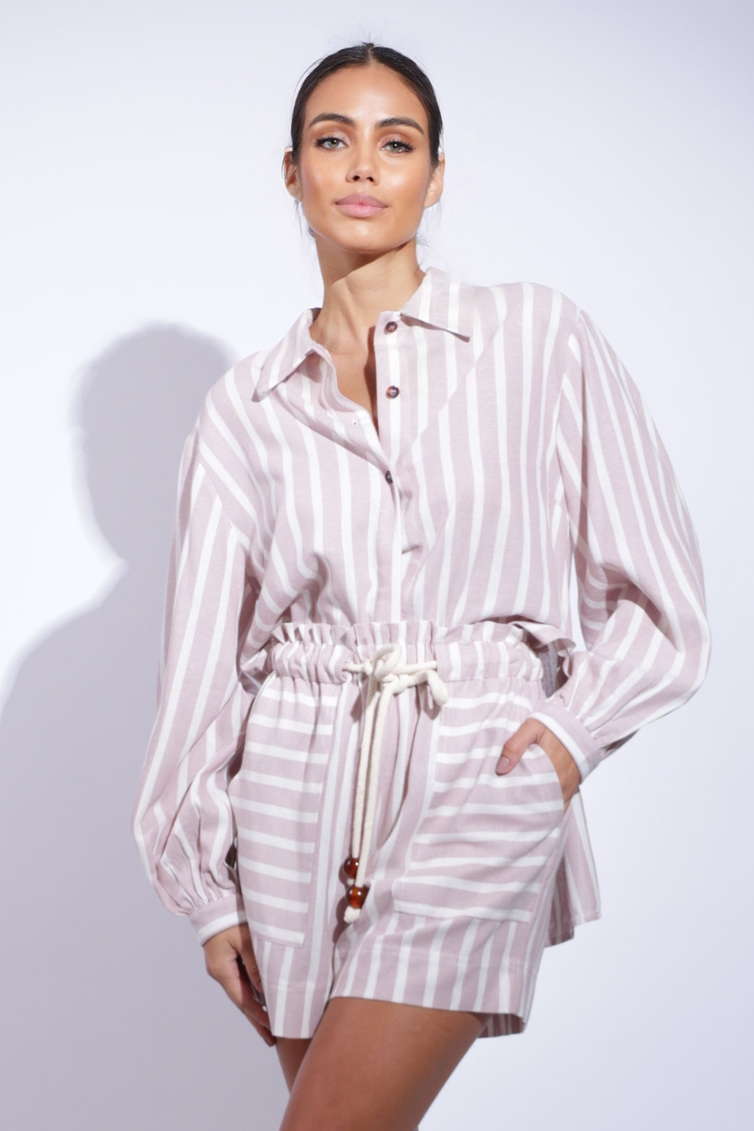 A camisa é confeccionado em tecido plano com padronagem listrada, posterior cruzado com amarração.