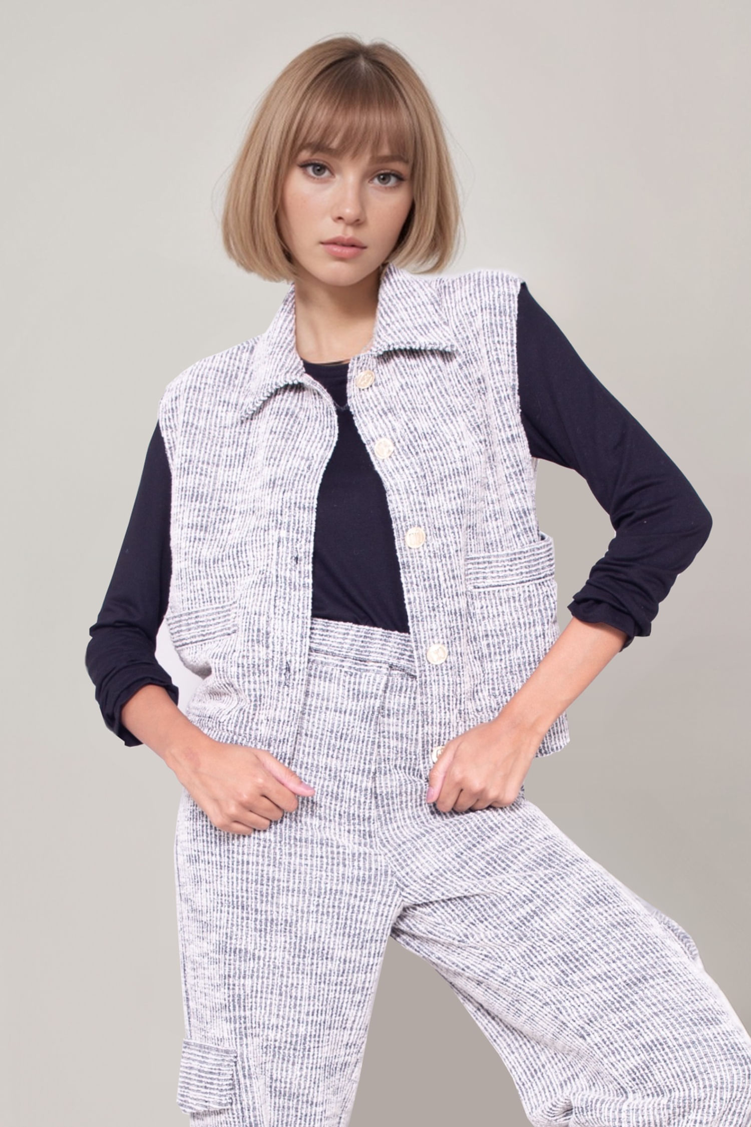 Com a elegância do tweed, o Colete Flávia transita facilmente entre diversas ocasiões, oferecendo um estilo contemporâneo e cheio de personalidade. Combine com mix de acessórios, a calça da mesma coleção e complemente com sapatilhas, para um look monocromático harmonico e trendy.
