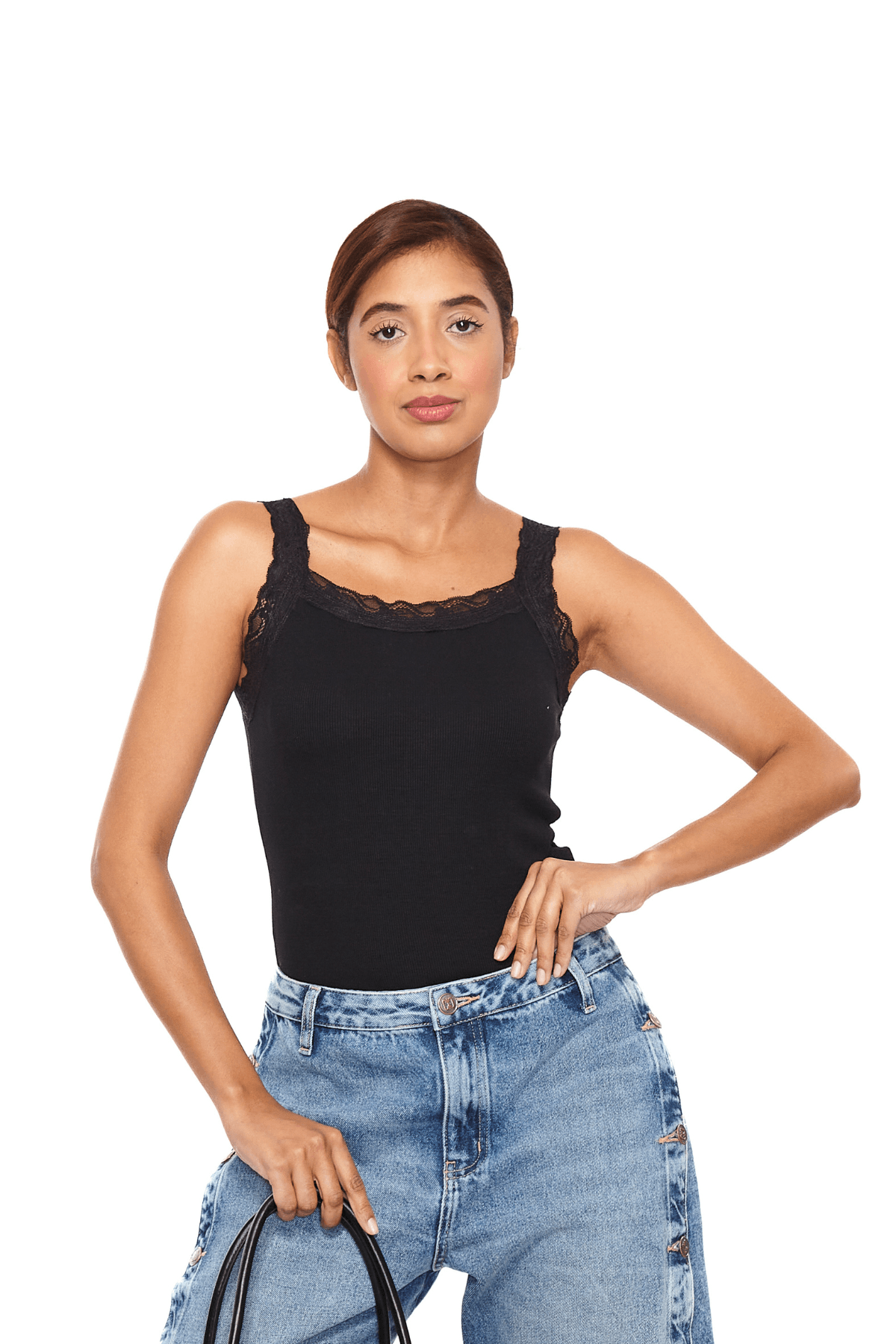 Regata preta com detalhe em renda, que acrescenta um toque delicado e sofisticado à peça. Possui modelagem confortável e caimento leve, ideal para compor looks elegantes ou casuais. Versátil, combina facilmente com jeans, alfaiataria ou saias, sendo perfeita para o dia a dia ou produções mais refinadas.