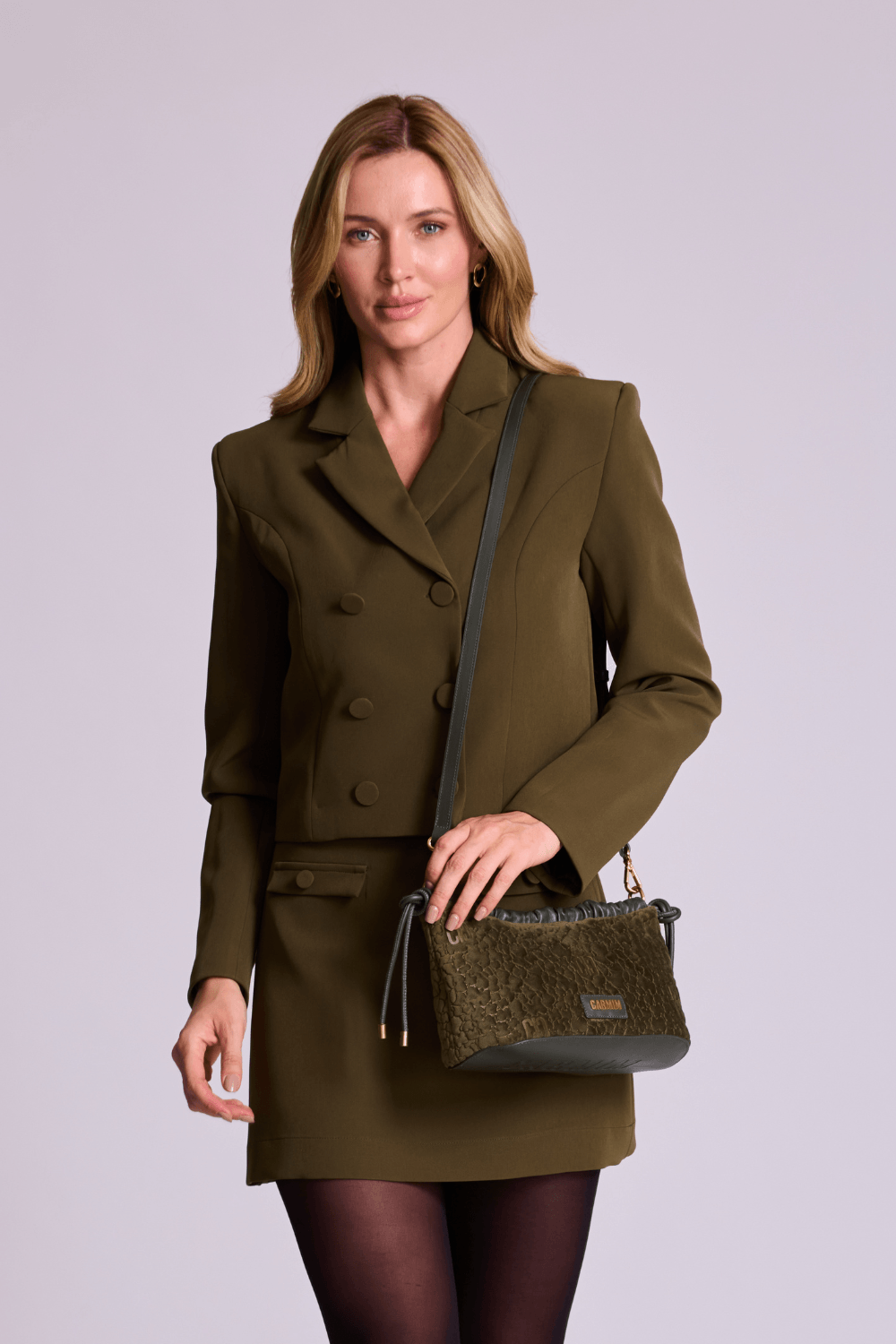A saia de alfaiataria verde militar traz elegância e modernidade em uma peça versátil e sofisticada. Com modelagem reta e comprimento curto, valoriza a silhueta e garante um visual contemporâneo.