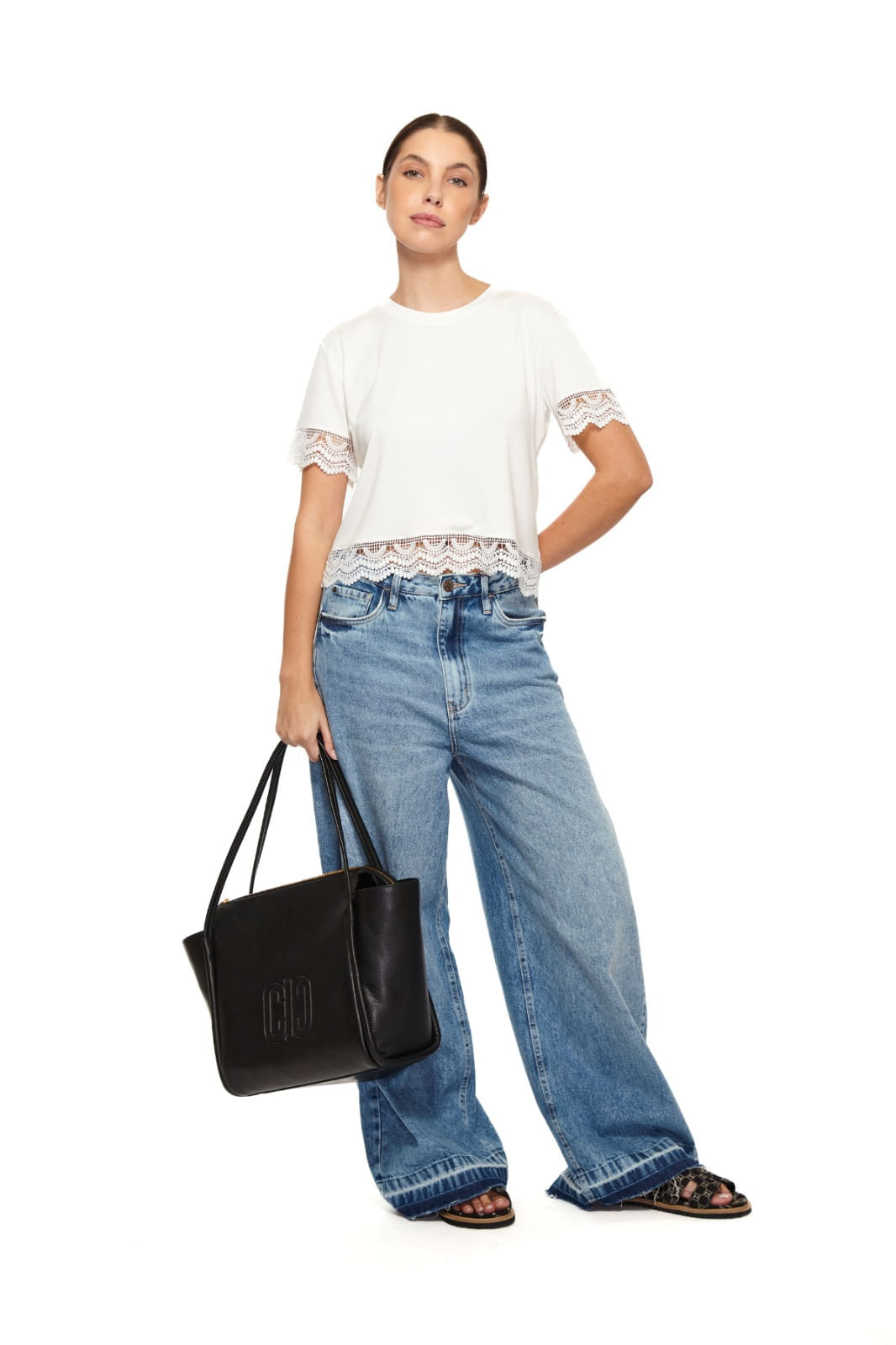 A Blusa com renda aplicada, possui decote redondo e acabamento pespontado.