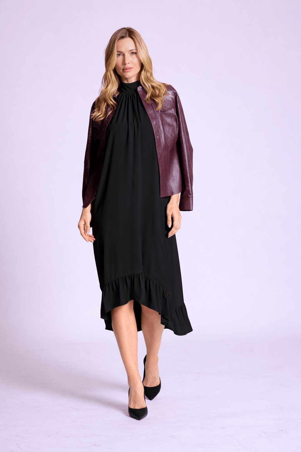 Com gola alta levemente franzida, a peça destaca a região do colo com delicadeza, enquanto a modelagem solta proporciona conforto e um visual refinado. A barra com recorte assimétrico e leve babado adiciona feminilidade e fluidez ao look.